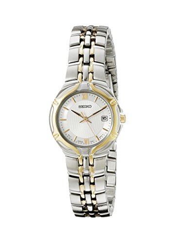 Unique details and classic styling make this Two-Tone Dress Watch from Seiko a sure bet for any sophisticated woman. Featuring a lightly-patterned white dial, gold-tone Roman numerals at six and 12 o'clock, stick indices, and three slender hands, this timepiece combines gold- and silver-tone stainless steel in its 27-millimeter case, stationary bezel, and bracelet band. Also offering a durable hardlex crystal, reliable Japanese quartz movement, and a convenient fold-over-push-button clasp with a safety, this watch is water resistant to 99 feet and is protected by a three-year manufacturer warranty.