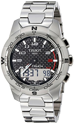 High-shine mens Tissot T-Touch II model in titanium, with a black carbon fibre dial with combination hour markers, and features chronograph, compass, two alarm, barometer, altimeter and date function, all accessible through the tactile sapphire crystal. The case and bracelet is solid itanium, so gives the watch a lightweight but luxurious feel.
