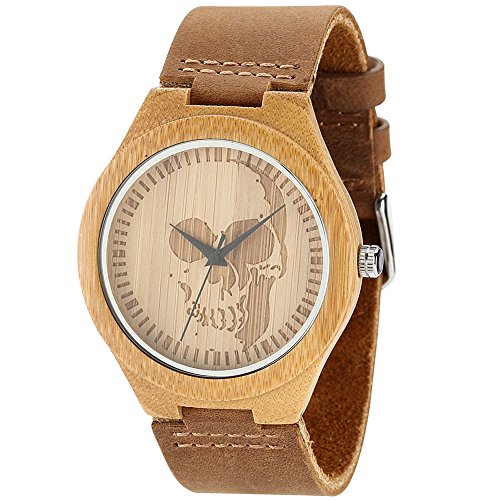 Best Seller! Wonbee Men's Bamboo Wood Watches with Natural Cowhide Leather Strap and Skull Design,Brown,Packaged in a Box,Bonus 2 Wooden Bracelets Review